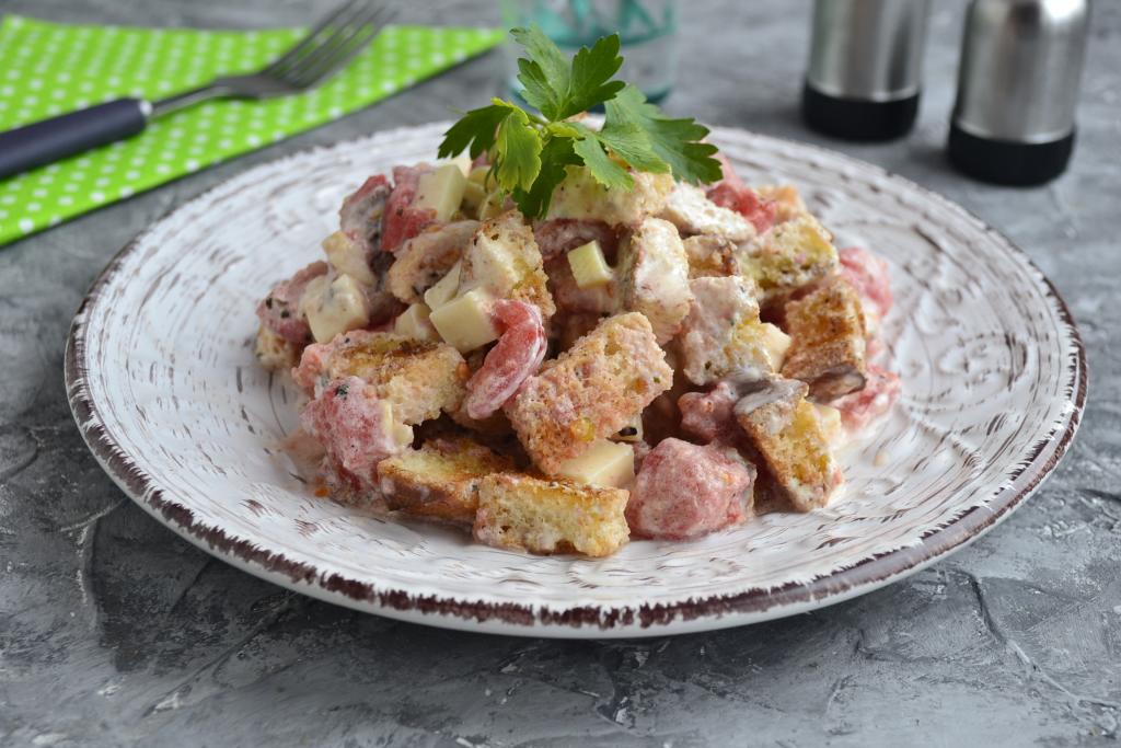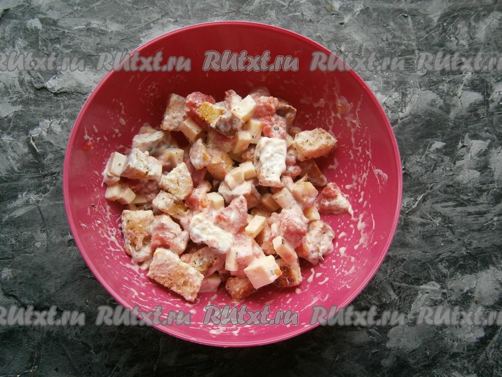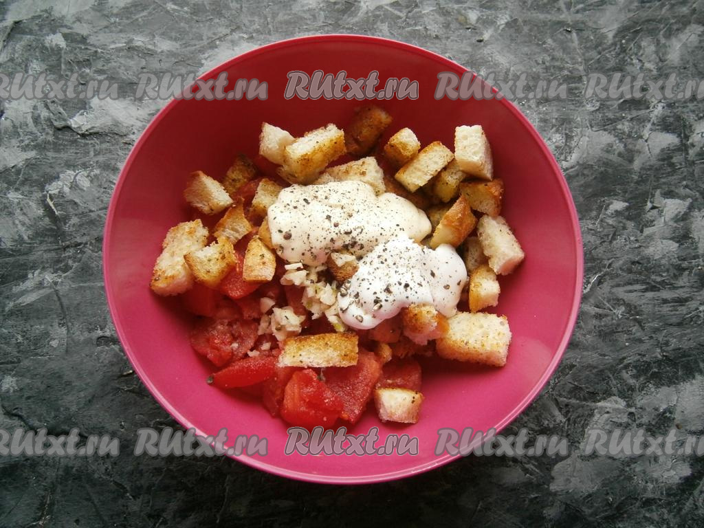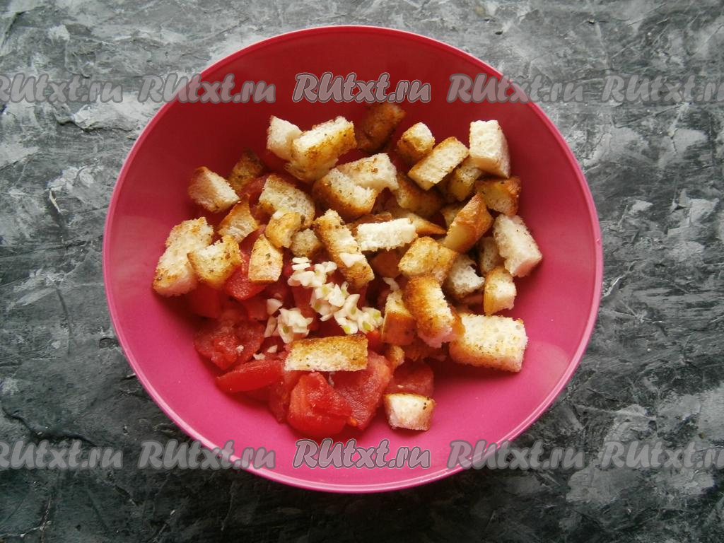 Добавить сюда же остывшие сухарики и мелко нарезанный чеснок.