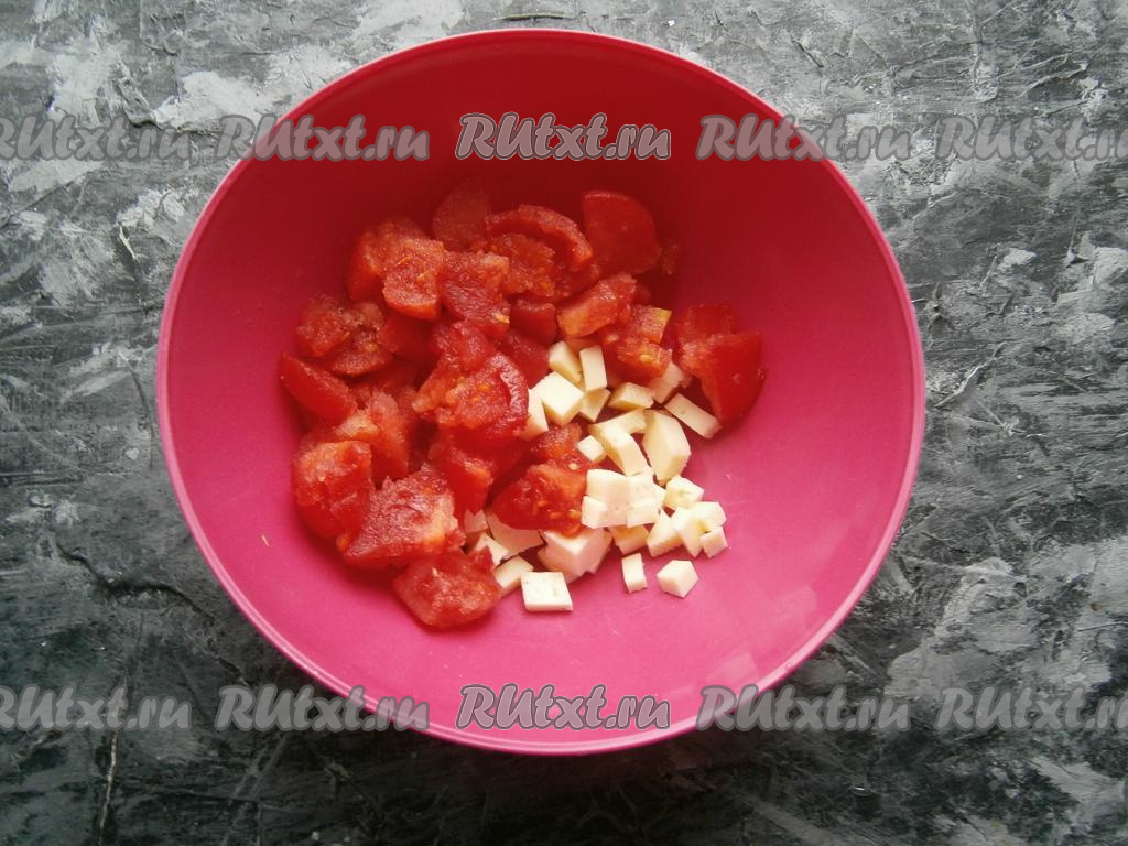 Помидоры у меня были мягковаты, поэтому я решила снять с них кожицу (для того чтобы снять кожицу, нужно сделать крестообразные надрезы сверху помидоров и залить их кипятком на 2-3 минуты, затем поместить под холодную воду - кожица легко снимется). Если помидоры твёрдые, кожицу не нужно снимать. Нарезать помидоры средними кусочками, добавить нарезанный небольшими кубиками сыр.