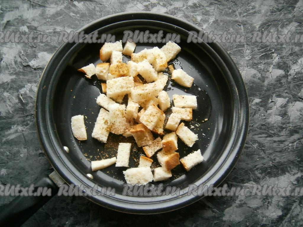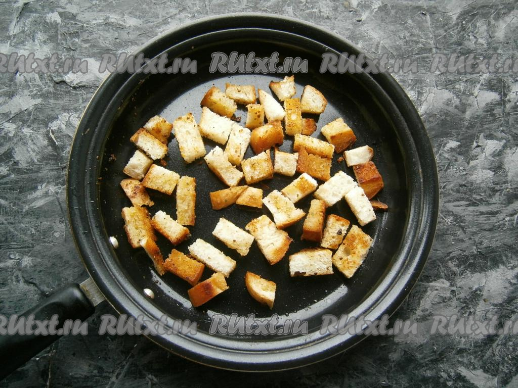 Обжарить батон на среднем огне, перемешивая, до золотистого цвета и до тех пор, пока кусочки батона не станут сухими. Дать сухарикам остыть.