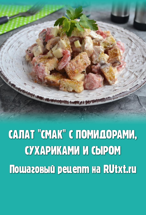 Хочу предложить вам попробовать совершенно простой по продуктам и приготовлению, но очень вкусный салат "Смак" с помидорами, сухариками и сыром. Такой салатик есть в меню многих кафе, попробуйте и вы! Этот салат нужно готовить на один раз и подавать сразу же!