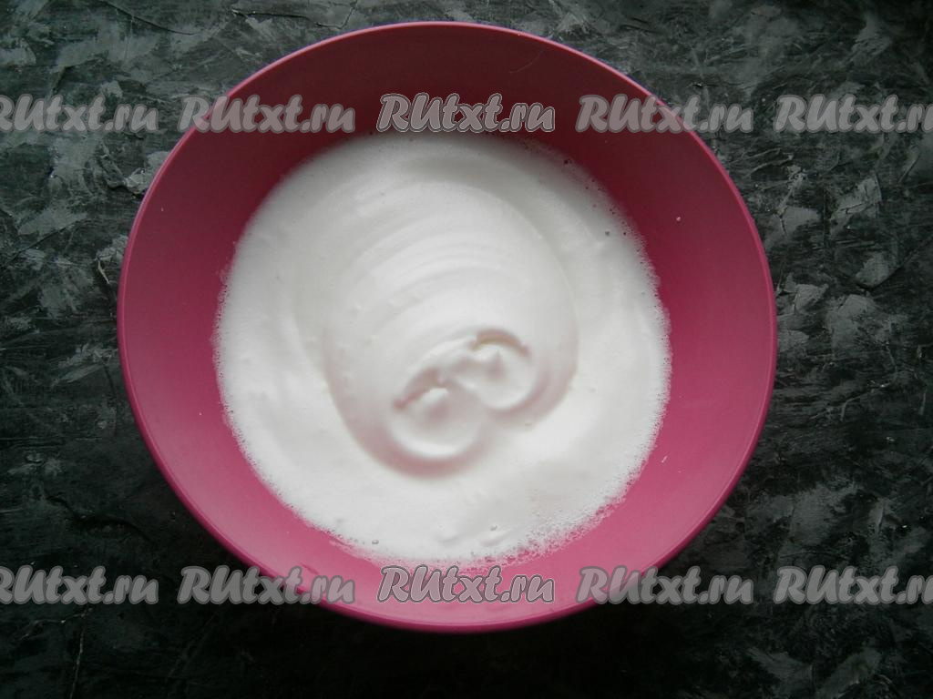 Белки взбить со щепоткой соли до пышности, а затем всыпать оставшиеся 30 граммов сахара и взбивать до лёгких пиков.