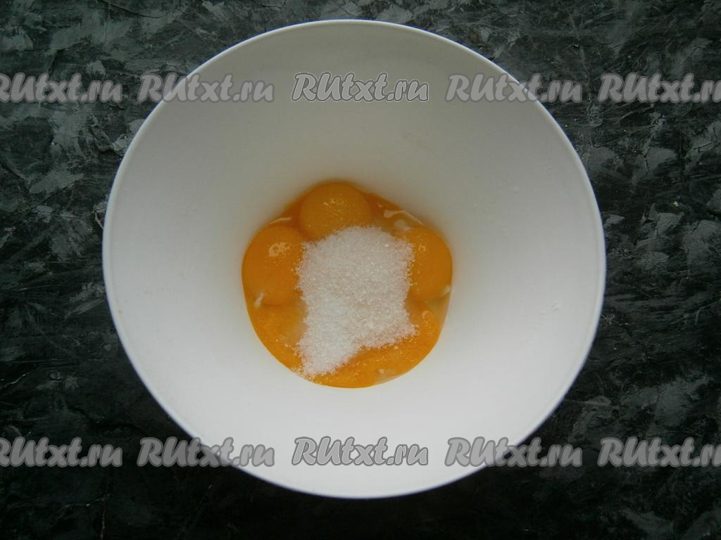 Для приготовления теста нужно аккуратно разделить 4 яйца на белки и желтки. Добавить к желткам ванильный сахар и 30 грамм сахара.