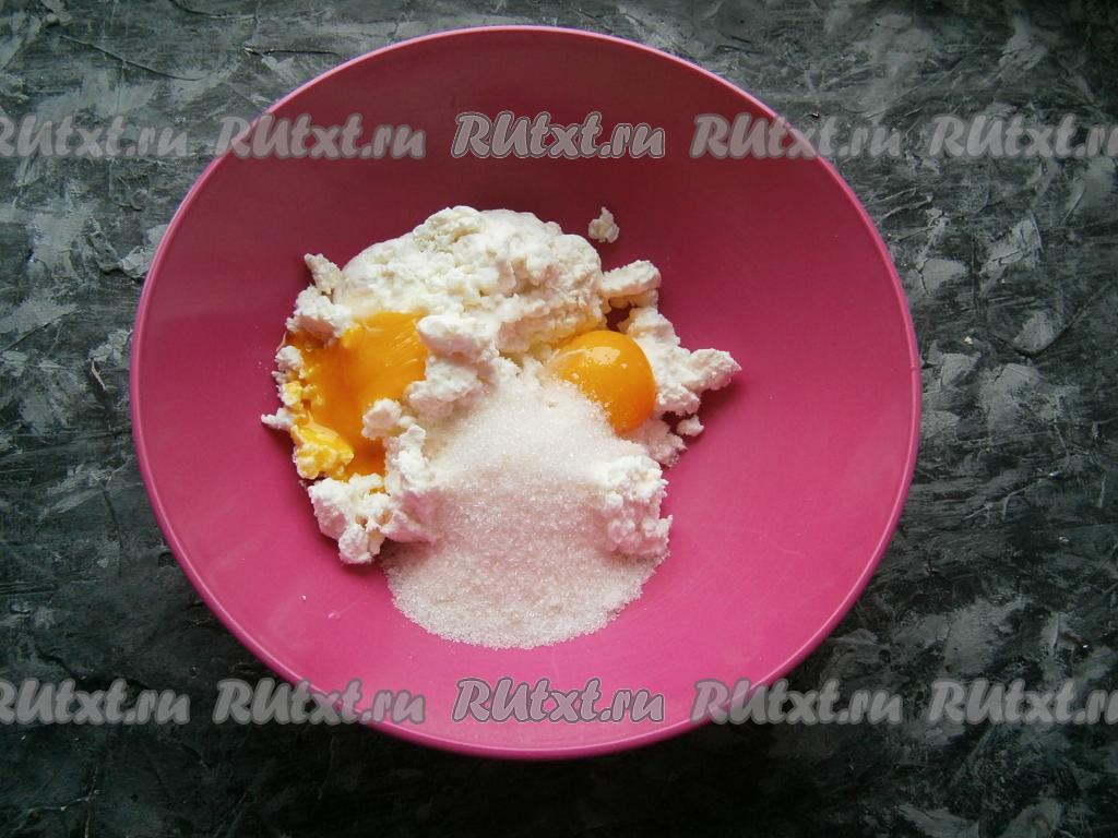 Для приготовления шариков в творог добавить сырые желтки, всыпать сахар.
