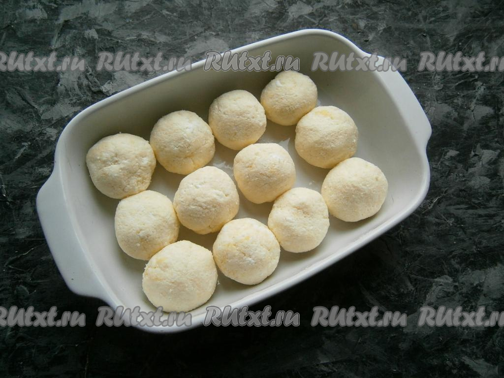 Из творожной массы сформировать шарики размером с небольшое яйцо (можете формировать шарики любого размера - не принципиально), разместить их в смазанной растительным маслом форме в один слой. Форма у меня размером 17х24 см. Советую дно формы застелить пергаментом - легче будет пирог извлечь после выпечки.