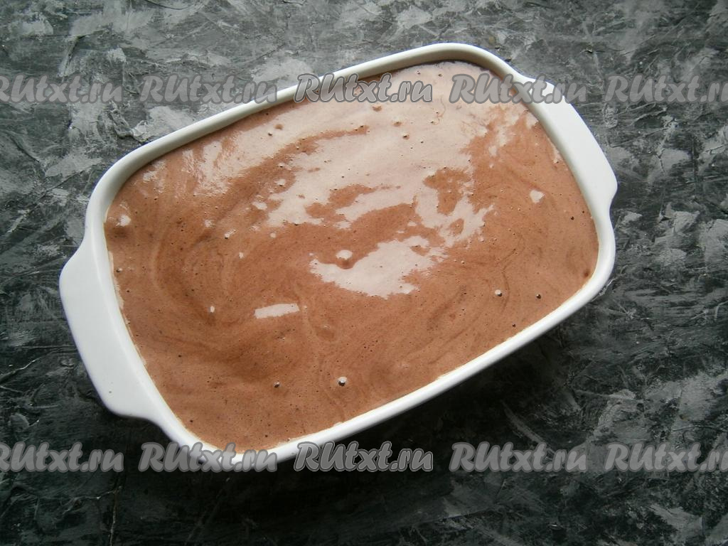 Залить творожные шарики подготовленным шоколадным тестом. Форму немного встряхнуть, чтобы тесто равномерно распределилось. При выпечке пирог слишком не поднимается, поэтому форма может быть заполнена доверху.