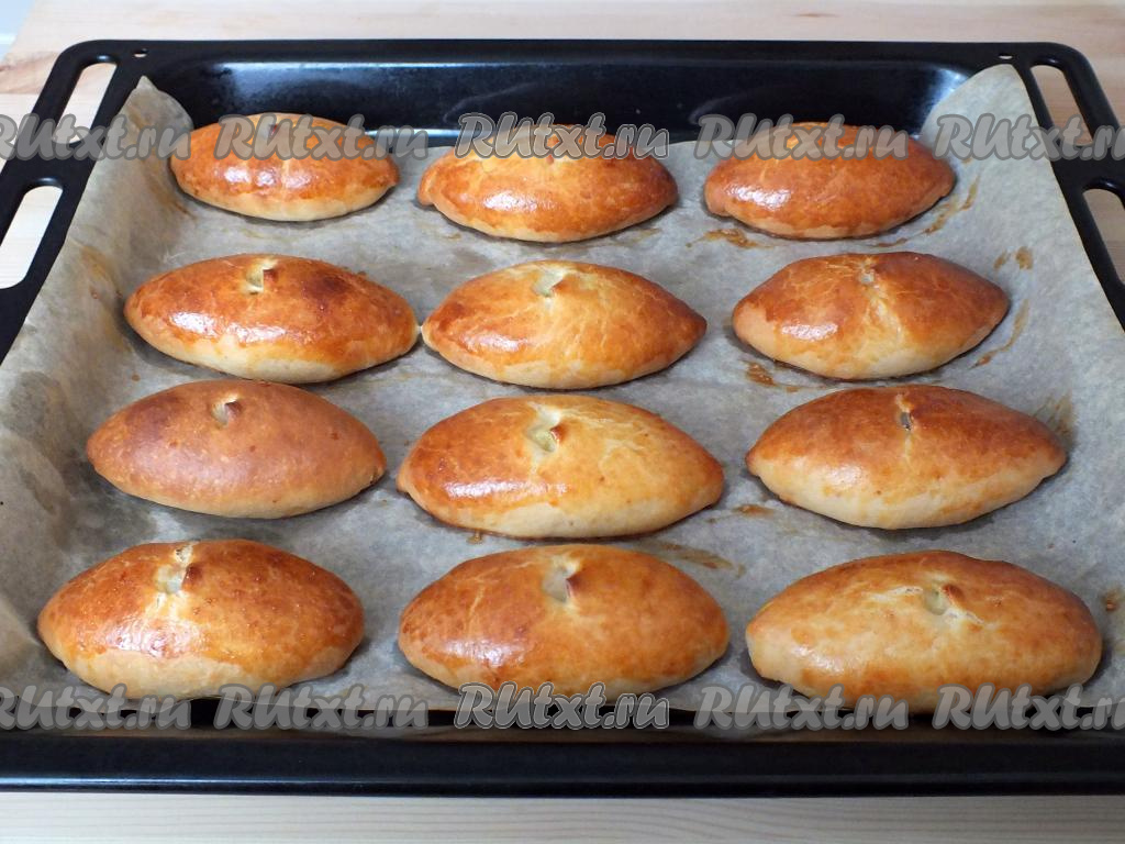 Подготовленные пирожки смажьте яйцом и поставьте в горячую духовку на 25 минут. Учитывайте особенности своей духовки!