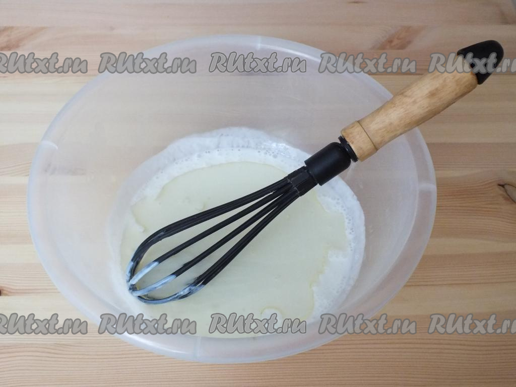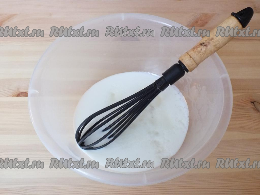 Для замешивания теста налейте в миску кефир комнатной температуры. Добавьте к нему сахар, соль и размешайте венчиком.