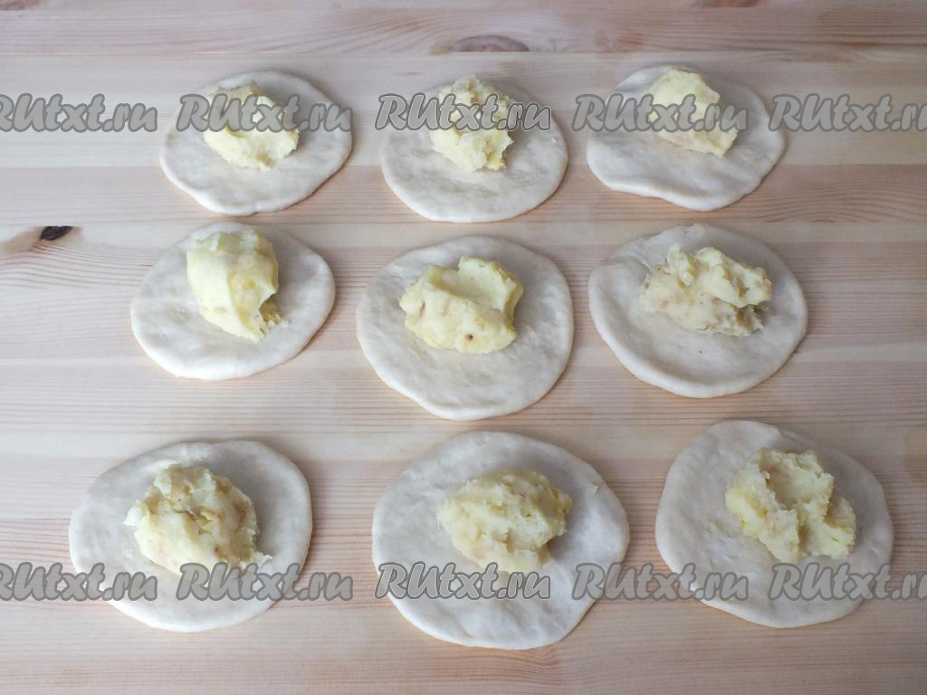 Каждому кусочку теста придайте форму лепёшки, выложите по 1 столовой ложке с горкой начинки.