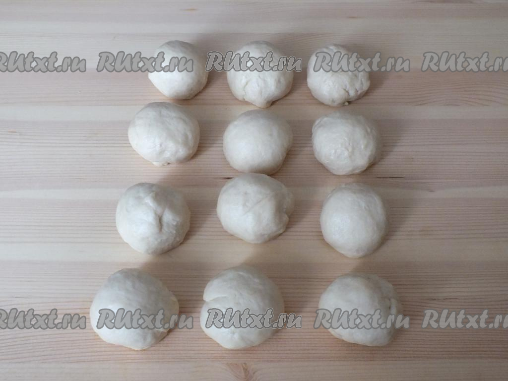 Когда тесто отлежится, разделите его на 12 равных кусочков. Очень удобно пользоваться, в этом случае, весами. У меня 1 заготовка получилась 52 грамма.