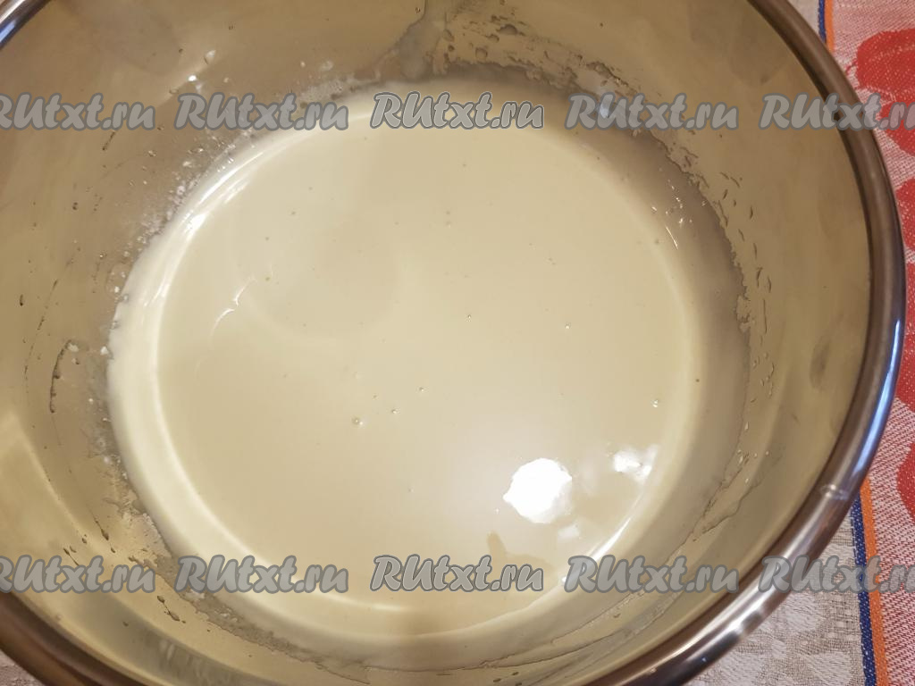 Взбить яйца с сахаром и мукой миксером (взбивать в течение 5-6 минут), в результате получится тесто, напоминающее по консистенции густую сметану.