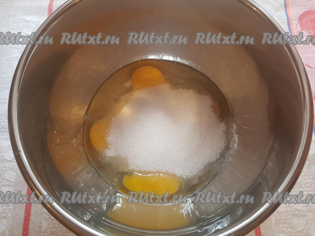 В миску разбить яйца, всыпать сахар.