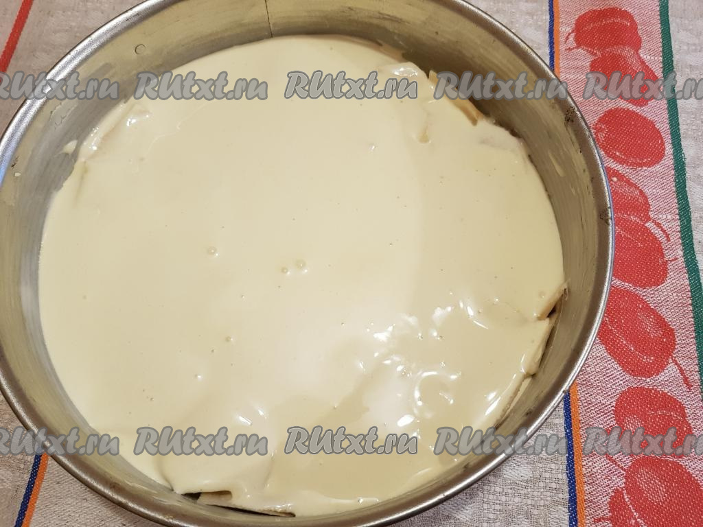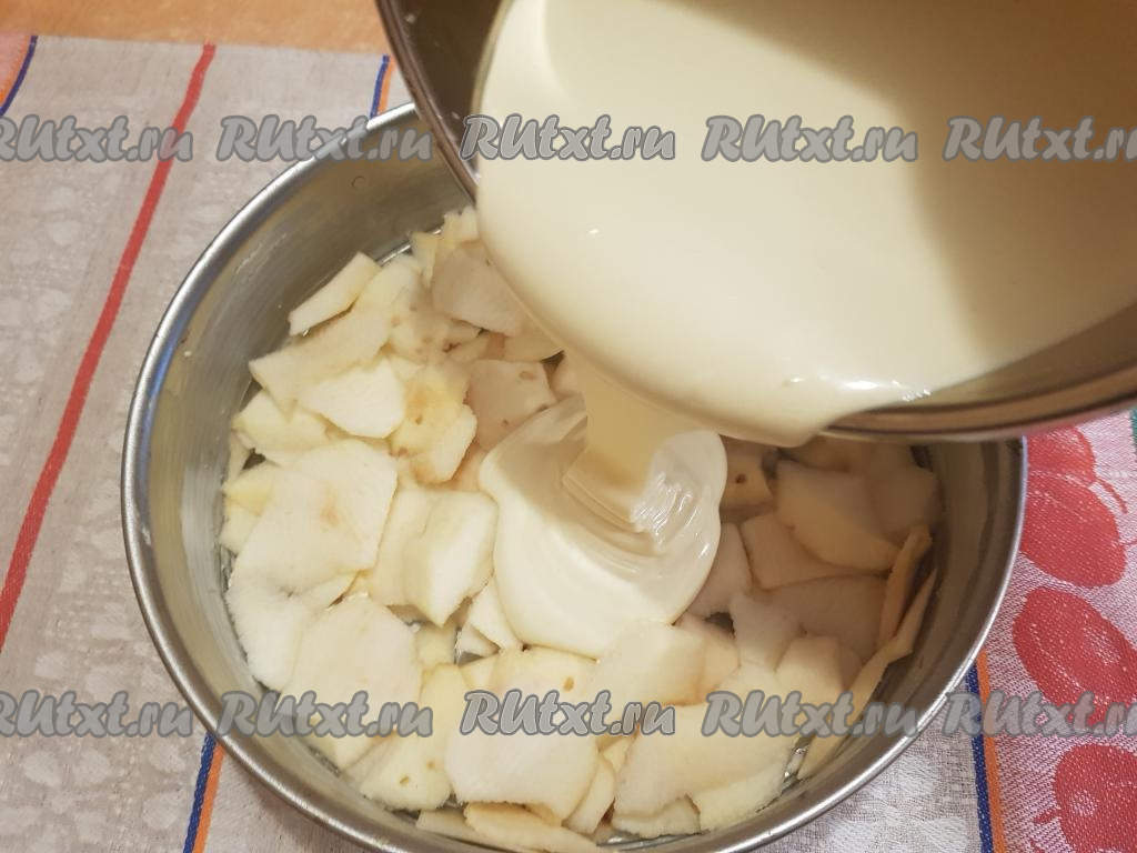 В форму для выпечки поверх яблок вылить тесто.