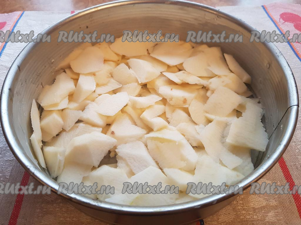 Смазать сливочным маслом форму для выпечки (у меня форма диаметром 25 см), нарезать яблоки кусочками и равномерно распределить их по дну формы.