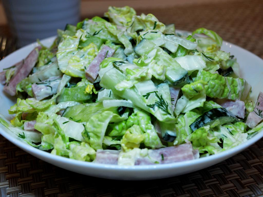 Огурец тоже нарежьте брусочками. Очистите репчатый лук и нарежьте его очень тонкими полукольцами или четверть кольцами (если не очень любите лук - просто его не добавляйте или замените на зелёный лук). Соединить в одной тарелке (или миске) подготовленные ингредиенты для салата: ветчину, мелко нарезанный укроп, пекинскую капусту, огурцы и лук.