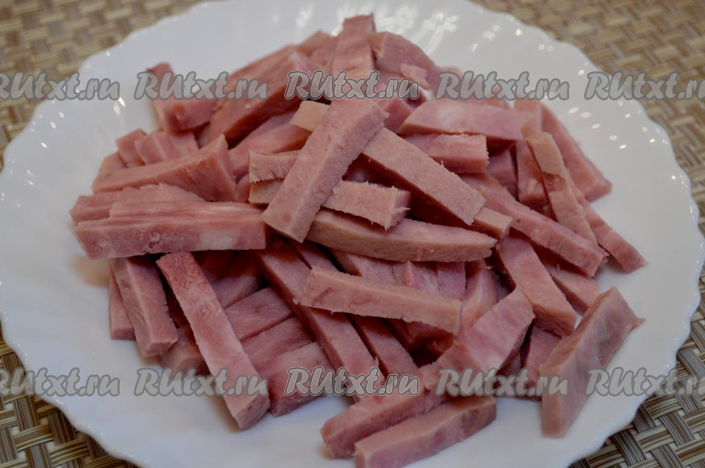 Ветчину нарежьте брусочками (для этого салата можно нарезать ветчину и кубиками).