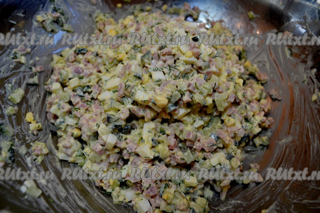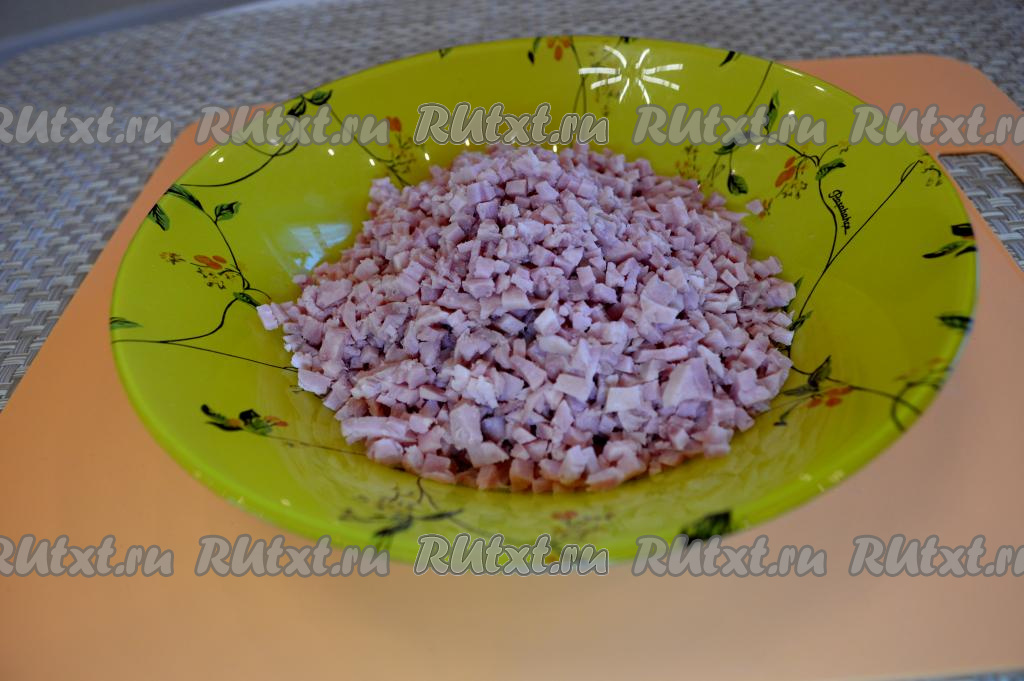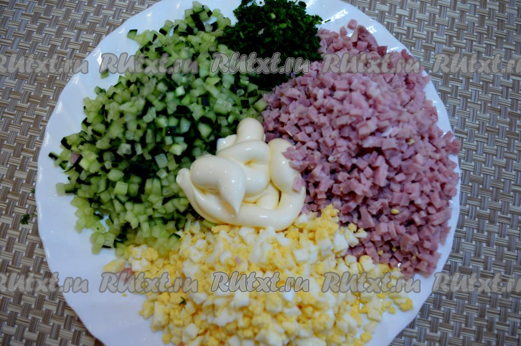 Нарезать на мелкие кубики и ветчину. В этом салате желательно, чтобы нарезка огурцов, яиц и ветчины была достаточно мелкой, а величина кубиков была, примерно, одинаковой.
