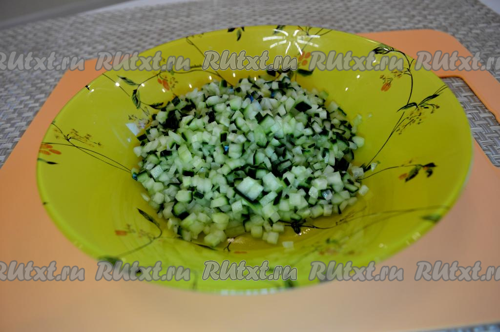 На мелкие кубики нарезать и огурцы.