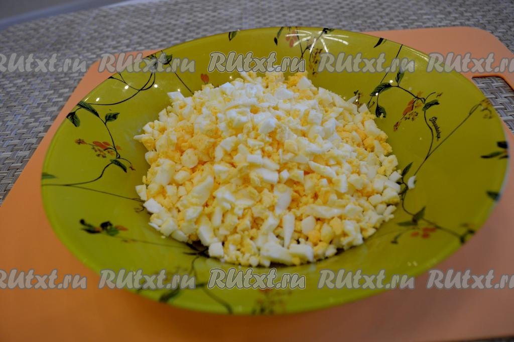Яйца сварить вкрутую (в течение 10 минут с момента закипания воды). Остудить яйца, очистить от скорлупы, а затем нарезать на мелкие кубики.