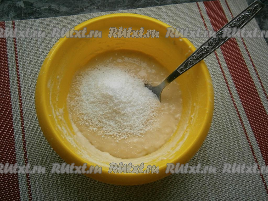 Замесить тесто, всыпать кокосовую стружку, ещё раз перемешать.