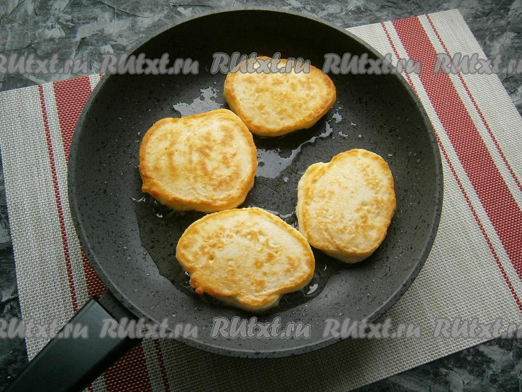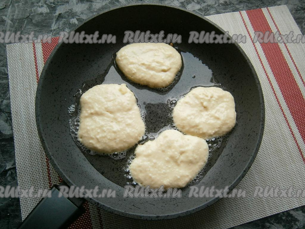 Разогреть достаточное количество растительного масла в сковороде и ложкой выкладывать тесто в виде лепёшек.
