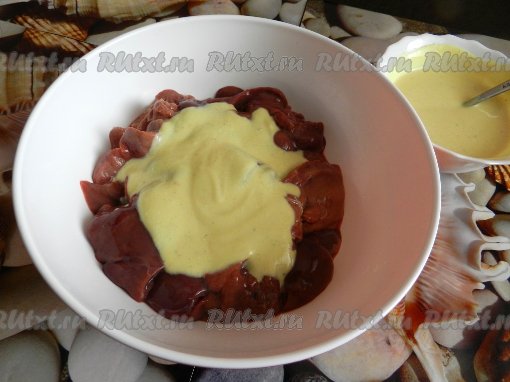 Примерно 2/3 соуса из кефира и горчицы отложить, в оставшемся соусе замариновать куриную печень на 30 минут.