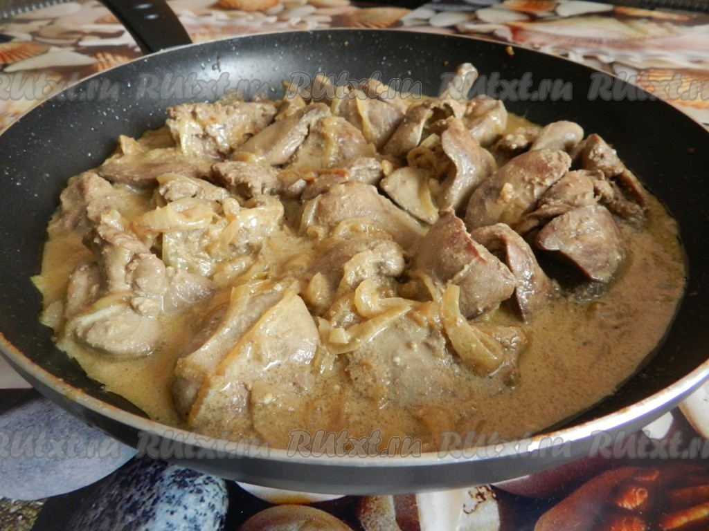 Куриную печень в соусе довести до кипения, уменьшить огонь и готовить под крышкой не более 5 минут.