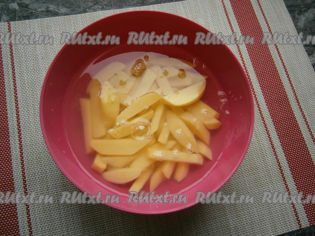 Нарезать картофель брусочками, залить полностью холодной водой и оставить на 7-10 минут.