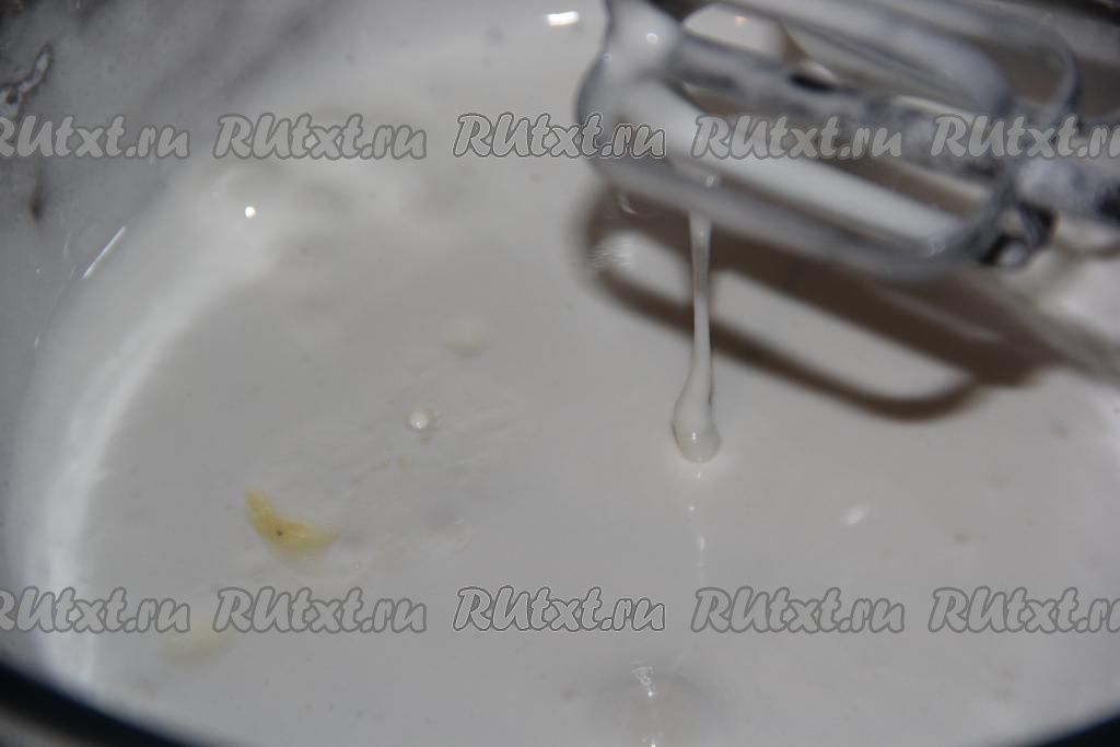 Затем, не прекращая взбивать, добавить сахарную пудру и взбивать в течение ещё 5-7 минут, далее влить сок лимона и ещё раз взбить.