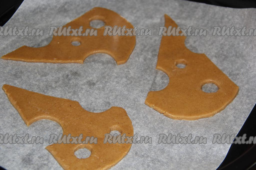 Раскатать готовое тесто в пласт толщиной, примерно, 5 мм. Вырезать из теста пряники произвольной формы. Я вырезала пряники в виде ломтиков сыра, дырочки сделала ножом. Противень застелить пергаментом, выложить пряники на противень.