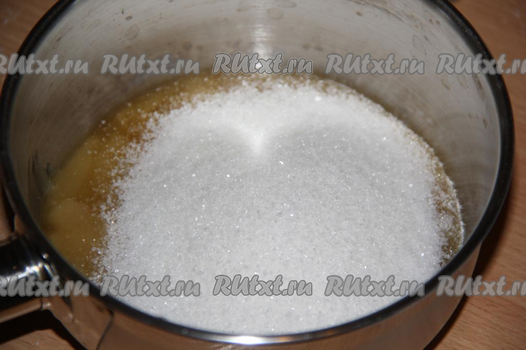 125 грамм сливочного масла достать из холодильника, чтобы оно, полежав при комнатной температуре, стало мягким. В сотейник выложить мёд и сахар.