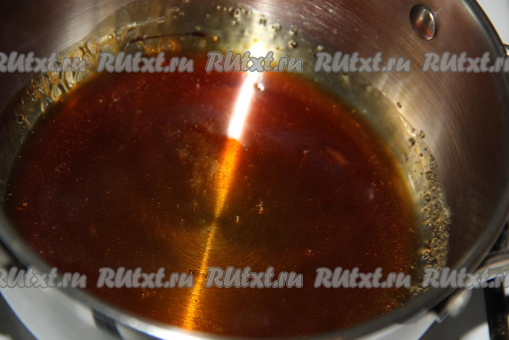 Дать сливочному маслу полежать при комнатной температуре, чтобы оно стало достаточно мягким. Всыпать 50 грамм сахара в сотейник и поставить на небольшой огонь. Перемешивать сахар не стоит, лучше покачивать сотейник, пока весь сахар не растворится.