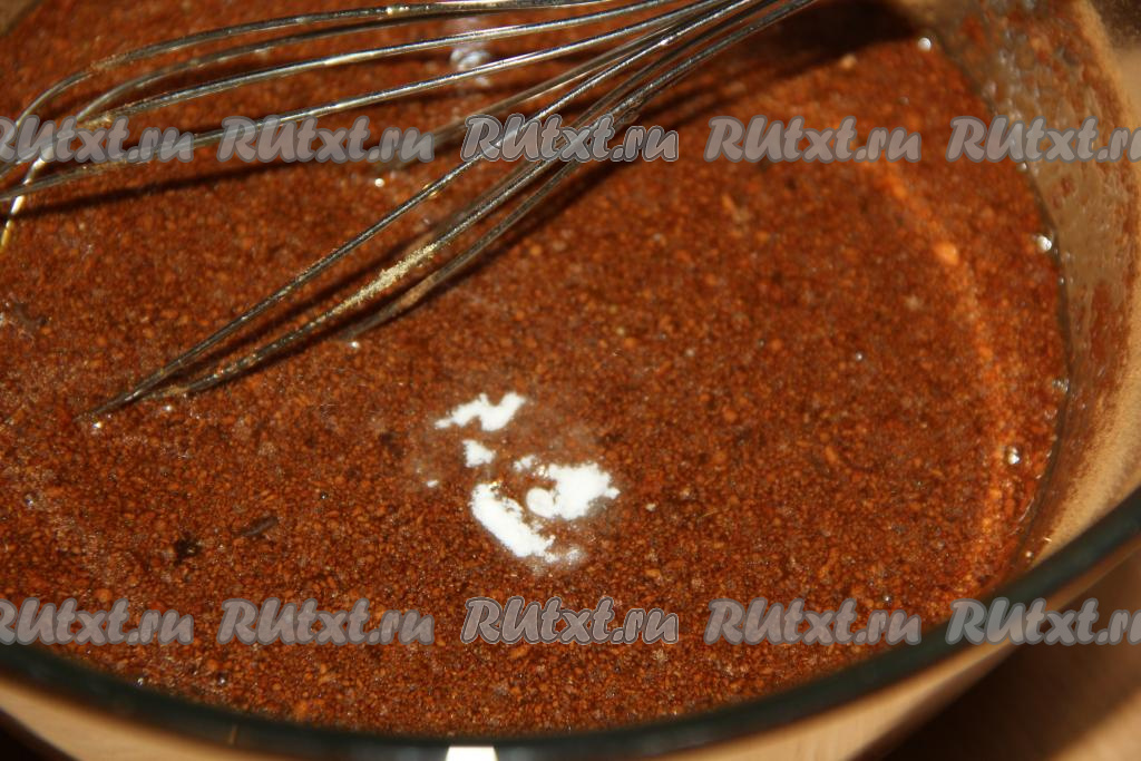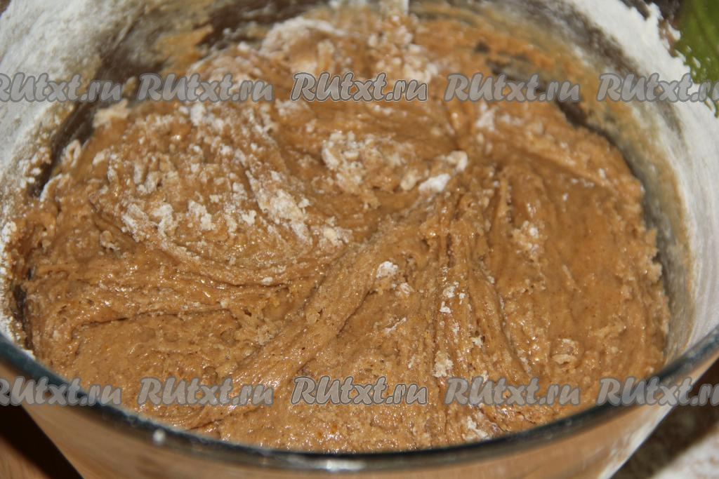 Добавить корицу, имбирь, мускатный орех, затем всыпать соду и тщательно перемешать массу.