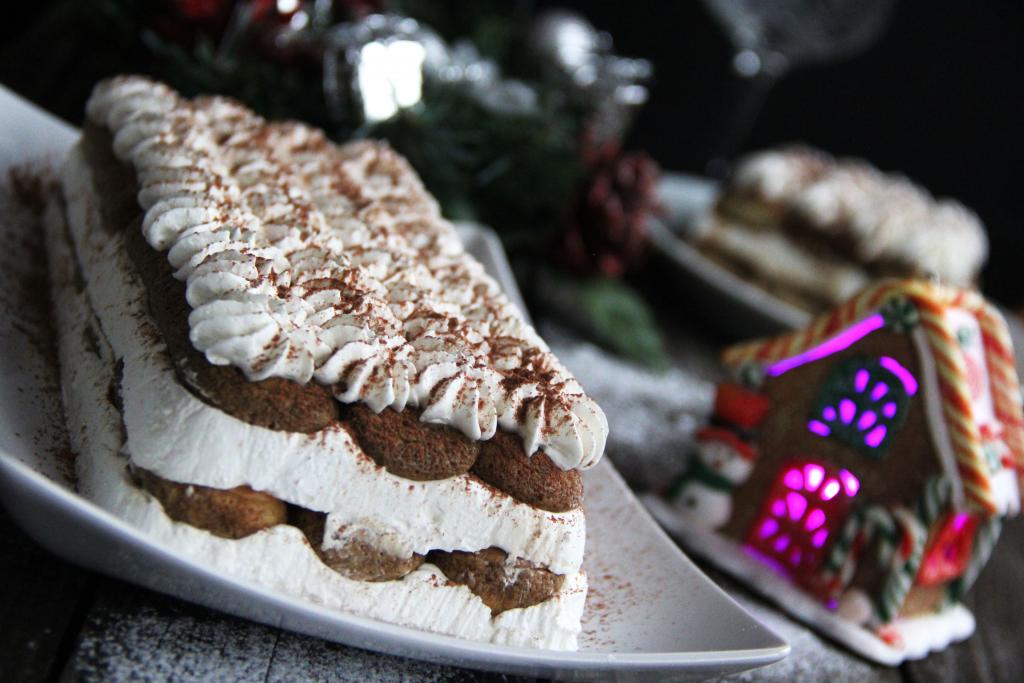 Готовый тирамису перевернуть на плоскую тарелку и удалить пищевую плёнку.