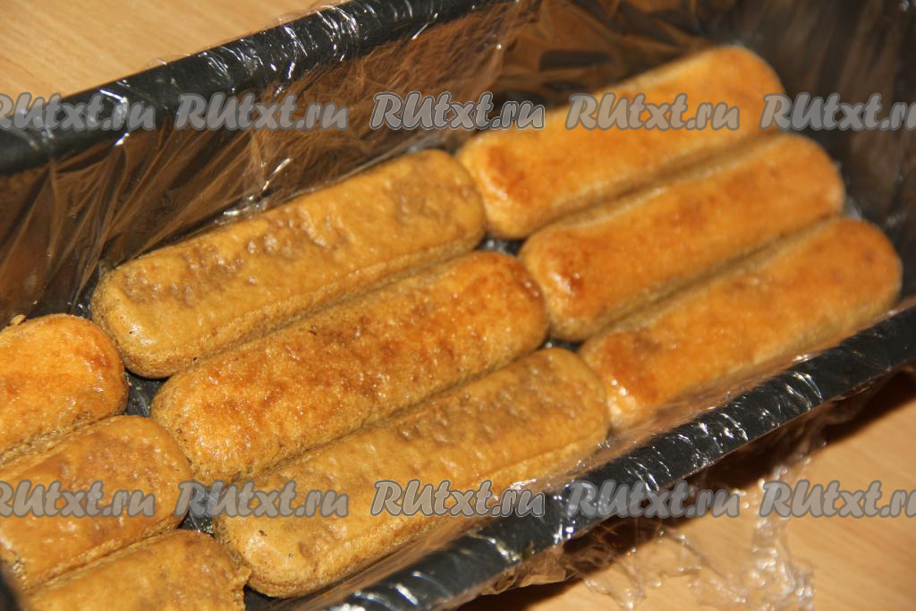 Я форму предварительно застелила пищевой плёнкой. Выкладывать печенье, которое предварительно обмакнули в кофе, в форму в один слой.