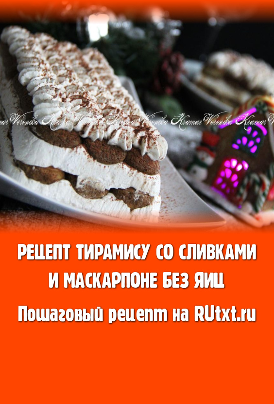 Верх десерта присыпать какао. Тирамису, приготовленный со сливками и маскарпоне без добавления яиц, получается очень нежным, вкусным и красивым.