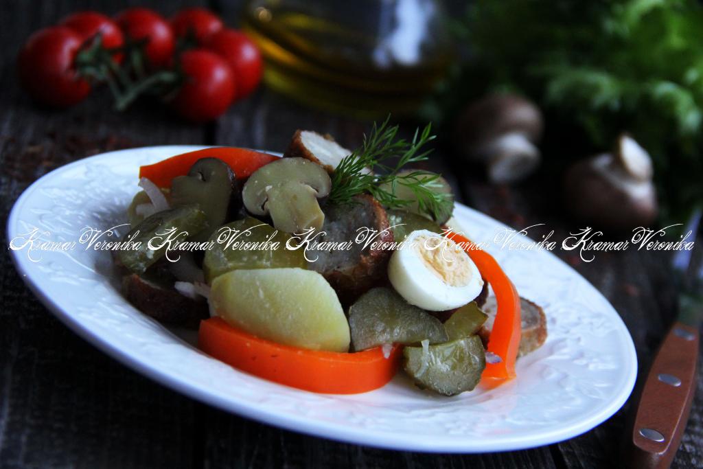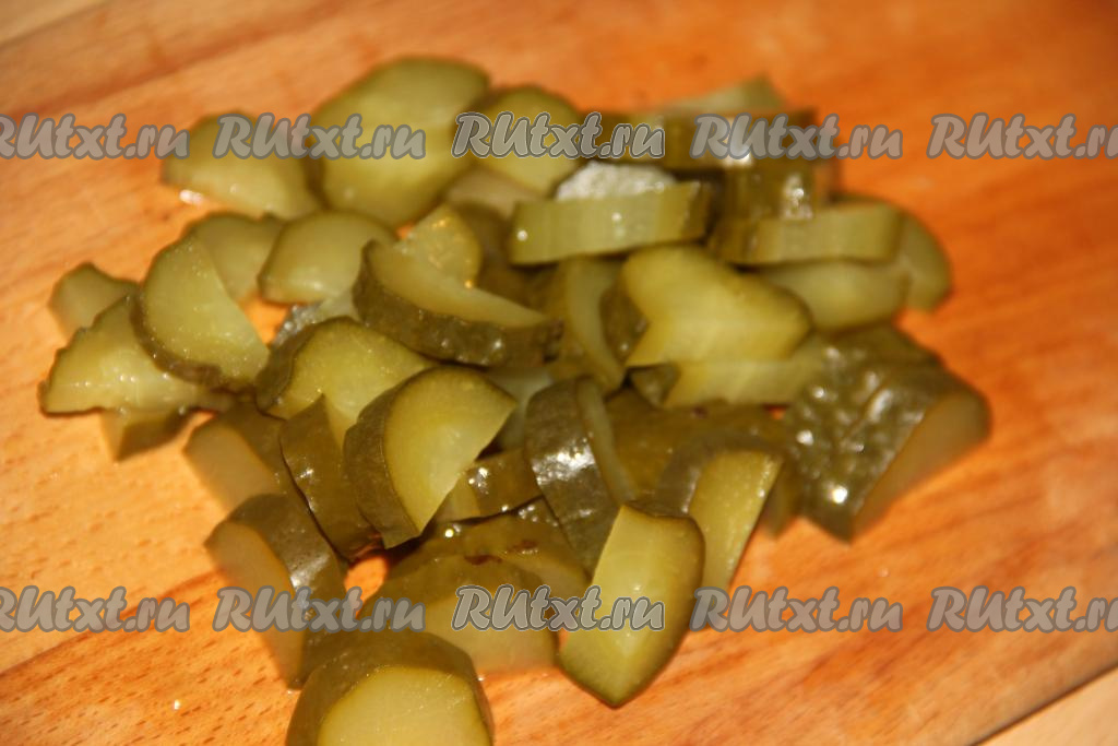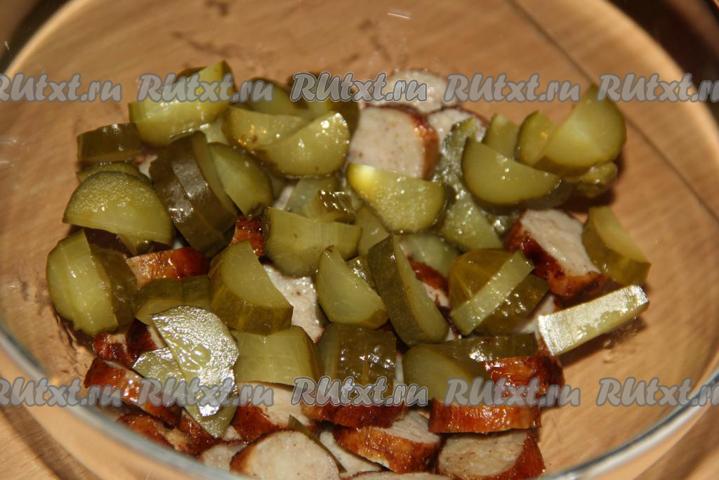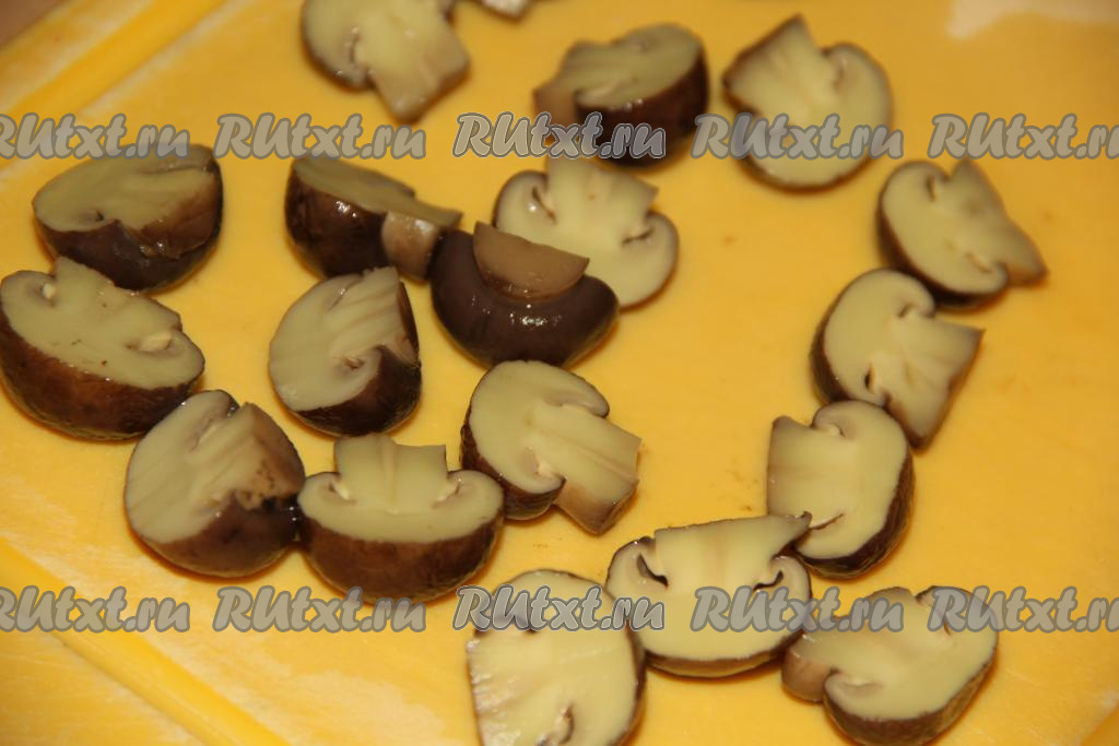 Маринованные шампиньоны разрезать пополам (если грибочки мелкие, то можно и целиком положить их в салат).