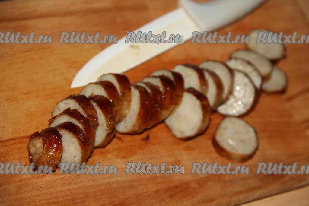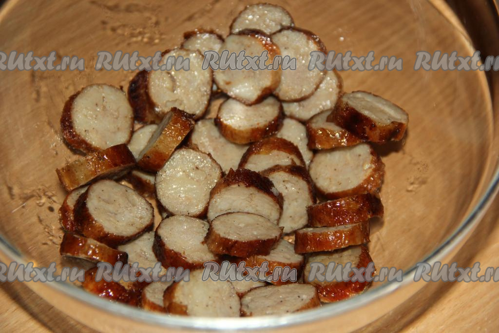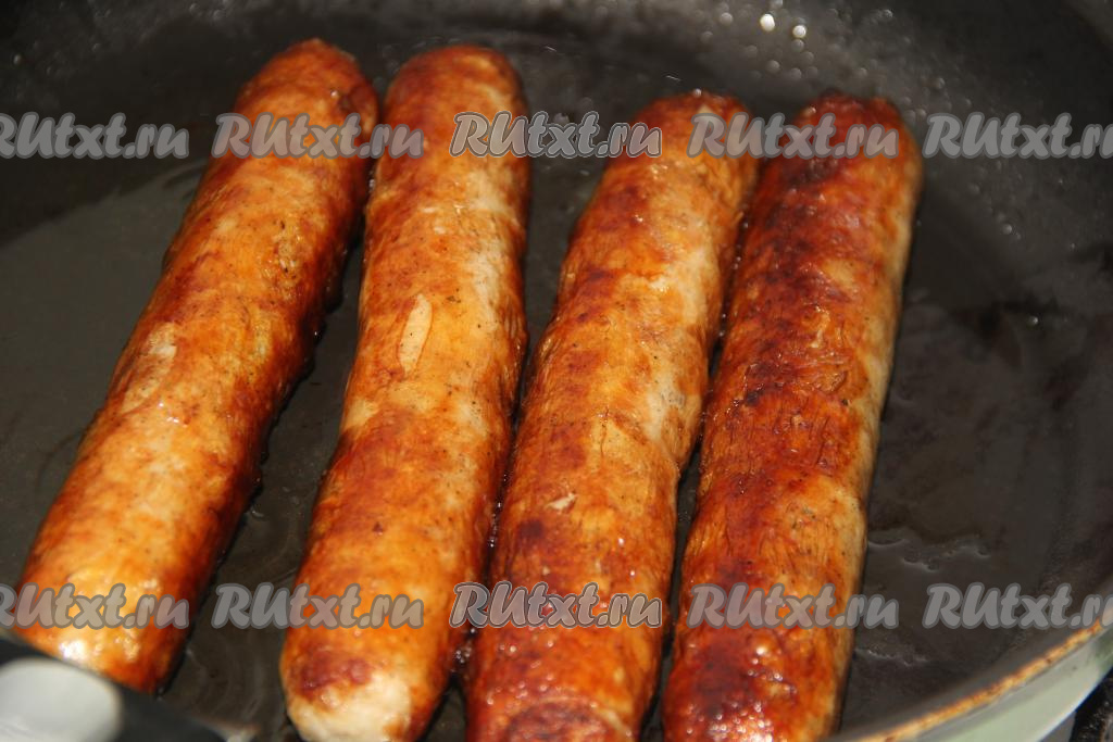 Баварские колбаски предварительно обжарить на сковороде на растительном масле на среднем огне до золотистой корочки. Я использую охлаждённые колбаски в натуральной оболочке. Готовятся такие колбаски в течение 5-7 минут. Затем остудить.