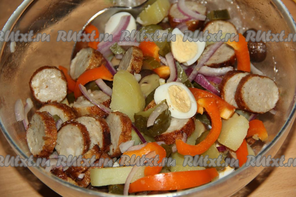 Заправить салат непосредственно перед подачей. Для заправки подойдёт майонез, растительное масло, соевый соус или даже уксус 9%-ный, выбирайте сами, что вам больше нравится. Салат с баварскими колбасками получается очень вкусным и сытным, обязательно попробуйте!