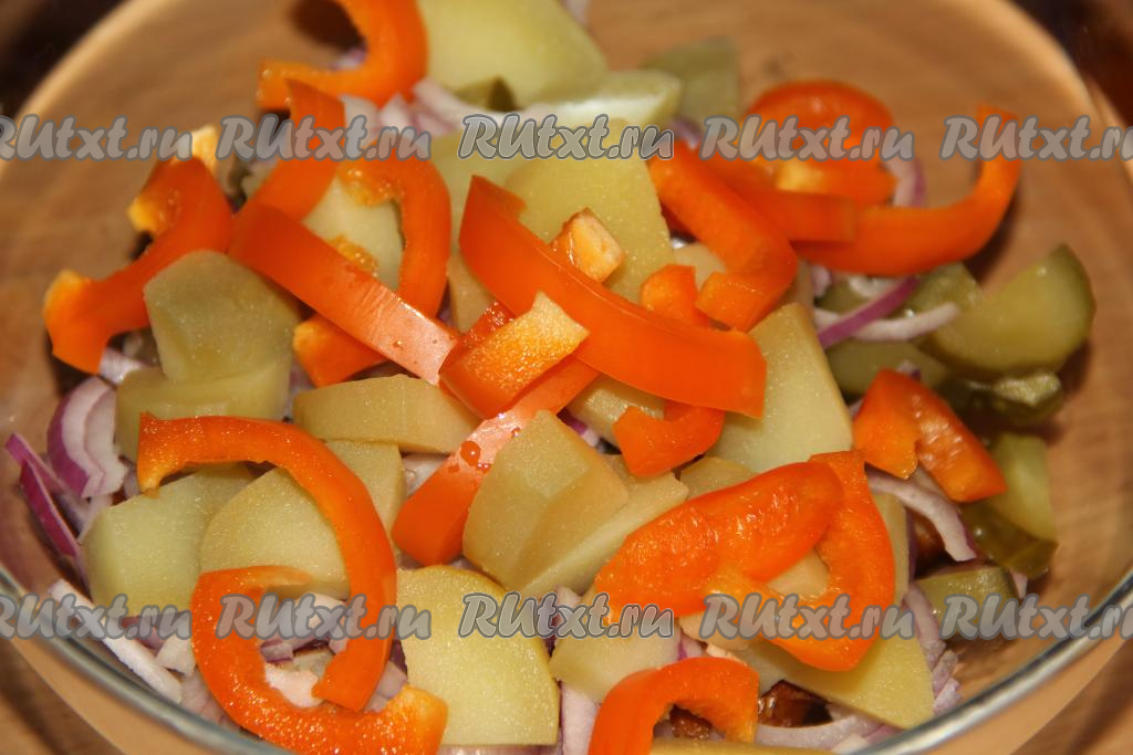 Картофель сварить в мундире, остудить, очистить и крупно нарезать. Добавить картошку и лук в салатник.