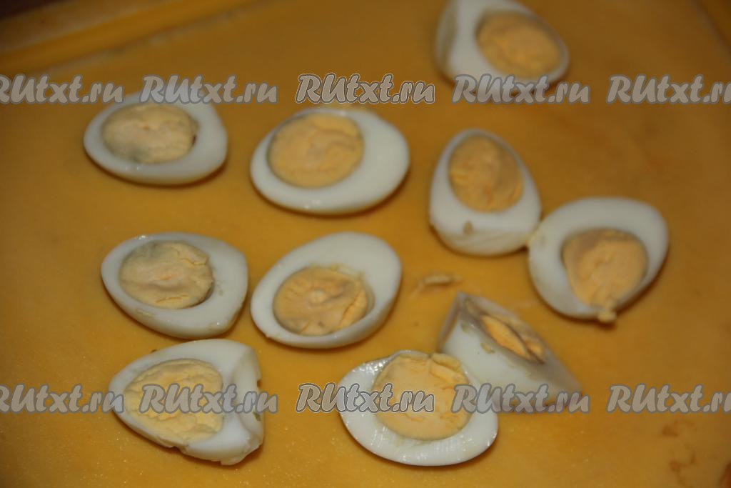 Перепелиные яйца сварить в течение 7 минут, остудить. Очистить яйца и разрезать на две части.