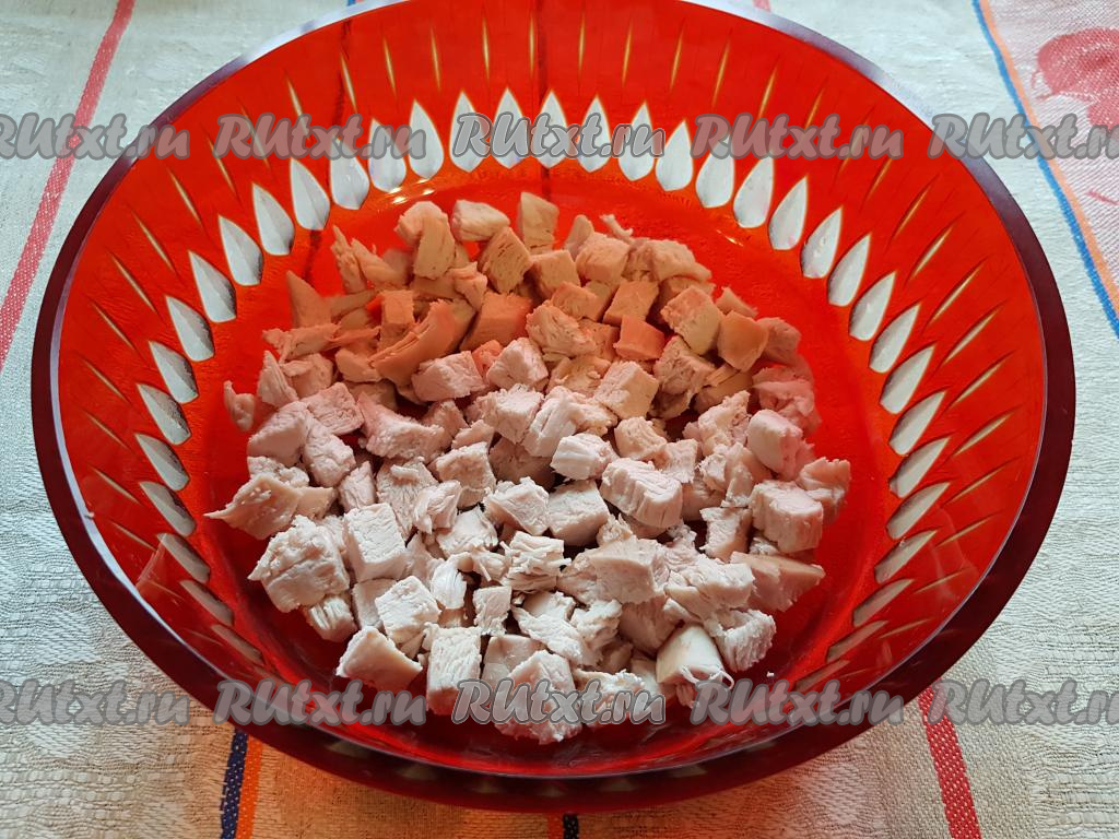 Выложить первым слоем в салатницу (у меня салатница диаметром 17 см) курицу.