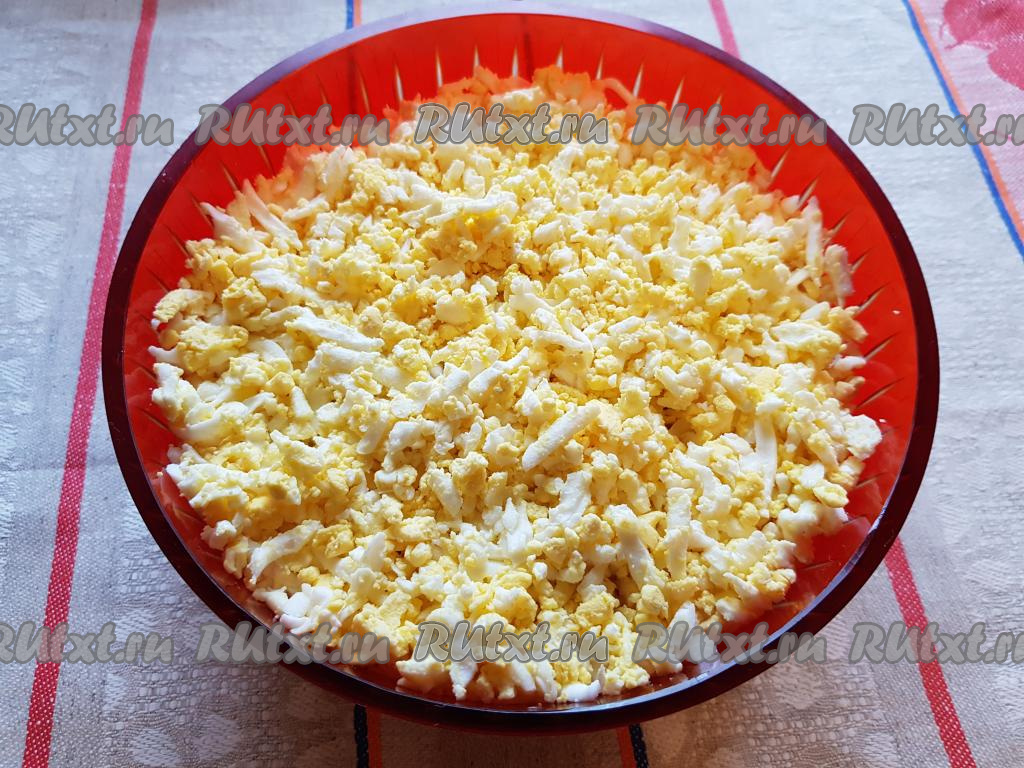 Следующим слоем выложить корейскую морковь (если морковка очень длинная - нарежьте её на части).