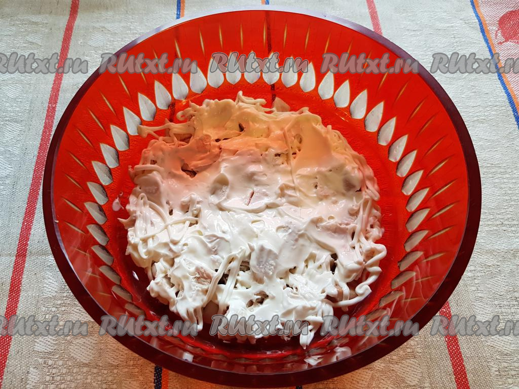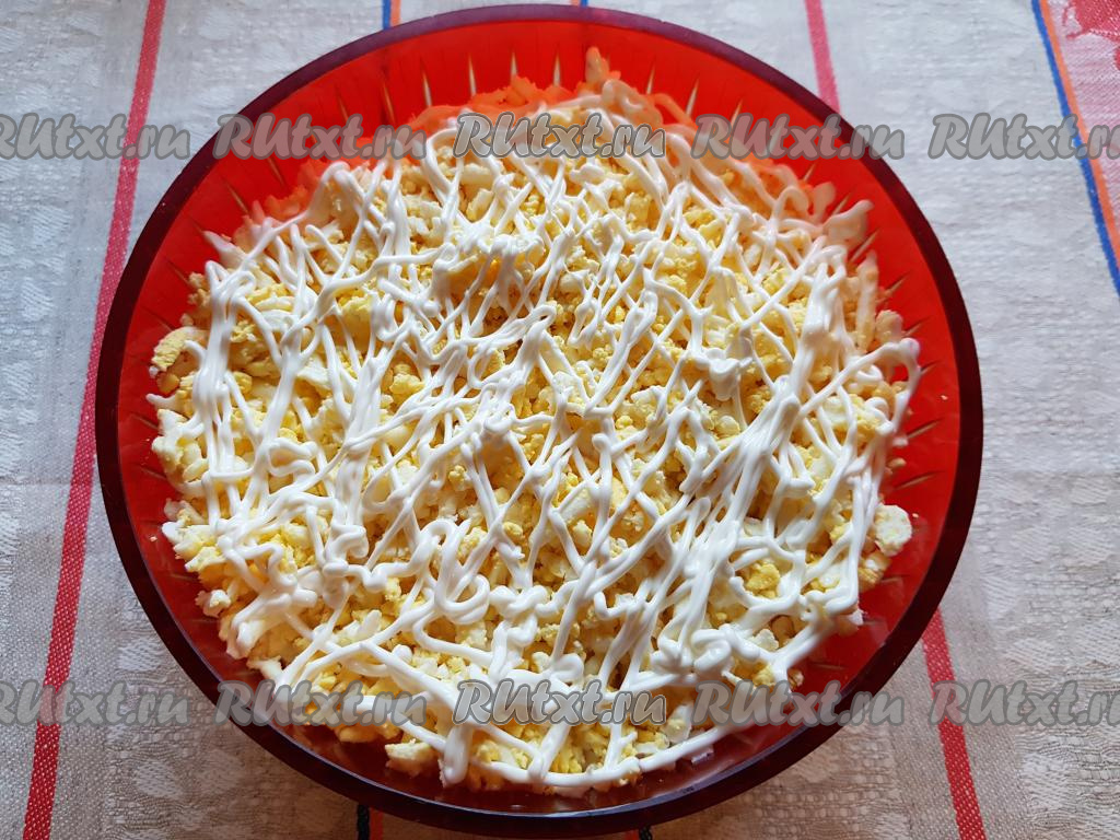 Смазать слой из корейской моркови майонезом (порой майонез сложно размазывать, поэтому я в пачке с майонезом надрезаю уголок и делаю сеточку из майонеза).