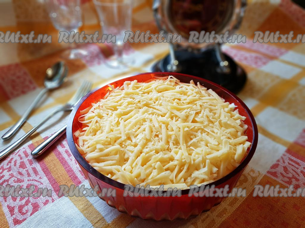 Натереть на крупной тёрке яйца и твёрдый сыр.