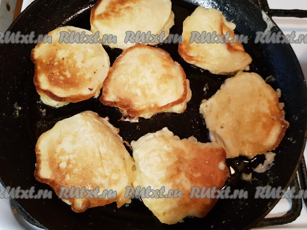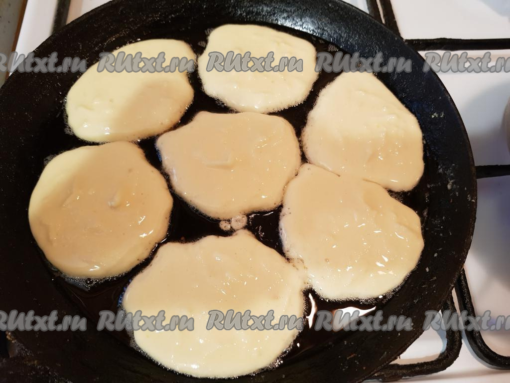 В сковороду налить подсолнечное масло, нагреть сковороду, затем выложить тесто ложкой, формируя оладьи. На каждый оладушек нужно чуть больше, чем по 1 столовой ложке теста.
