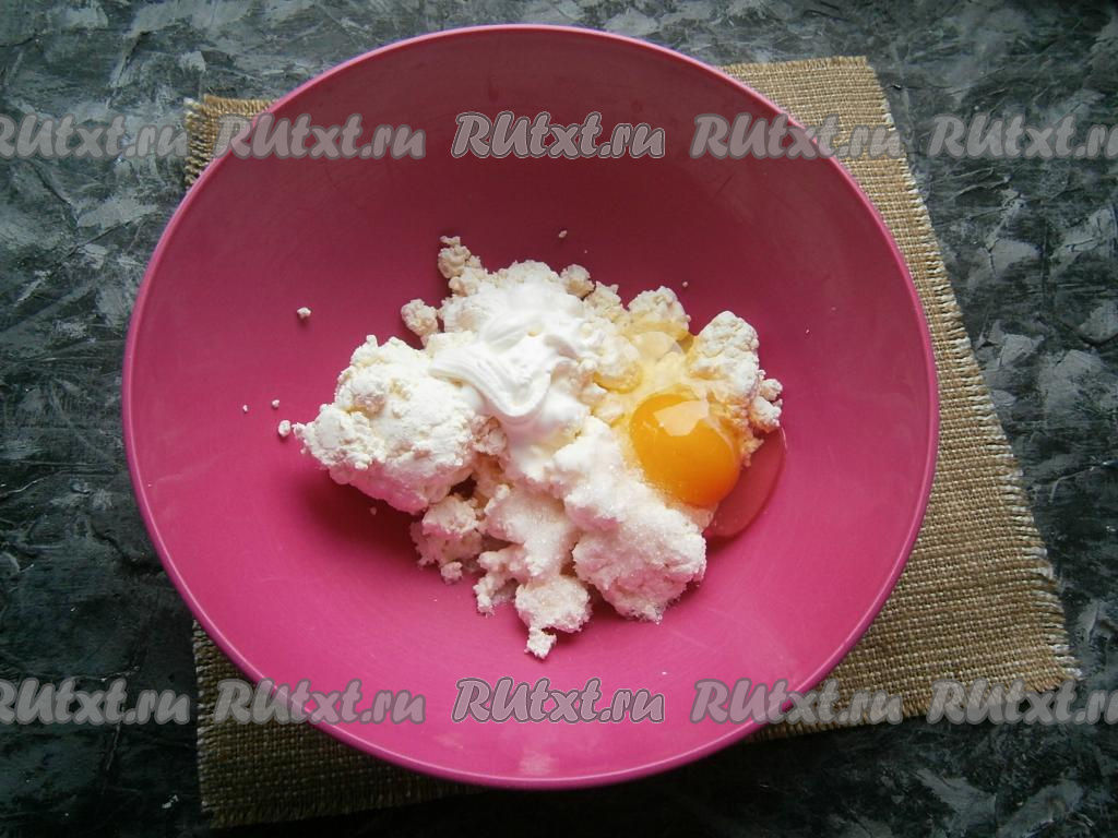 К мягкому творогу добавить яйцо, соль, сметану и сахар.