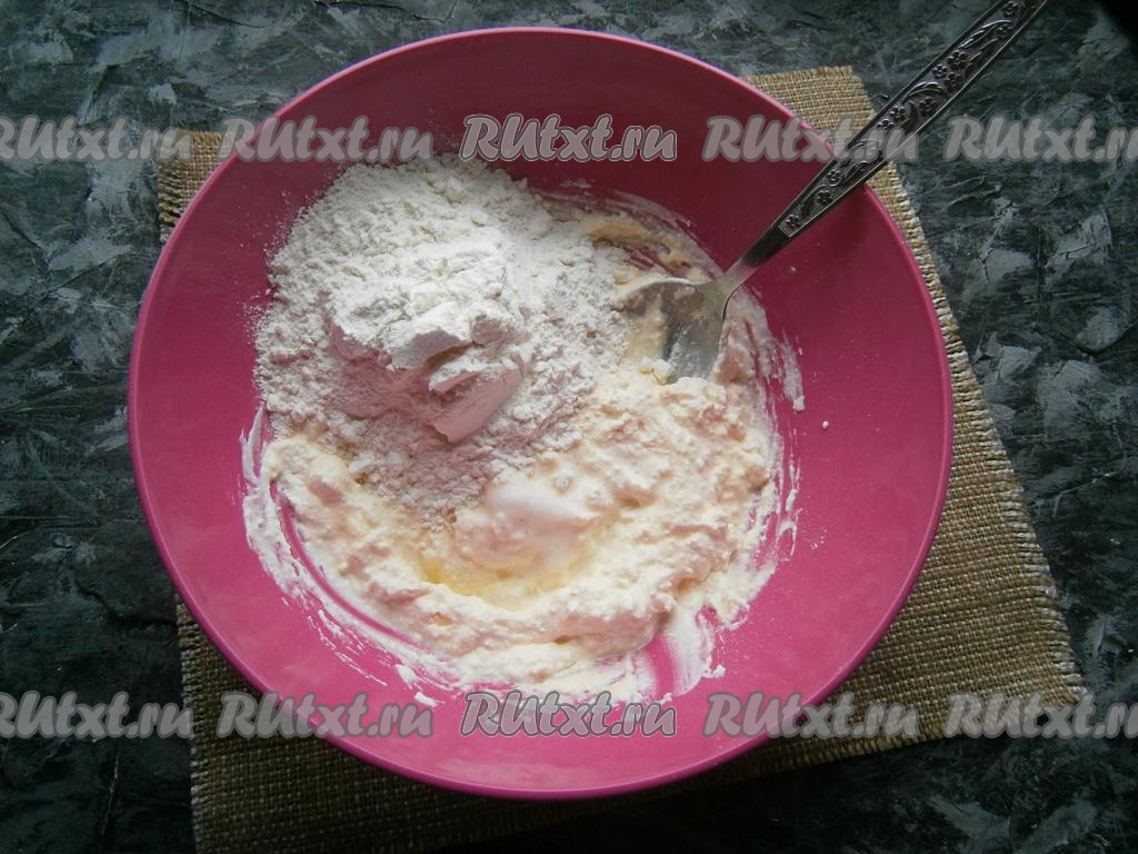 Влить 2 столовые ложки растительного масла, тщательно перемешать (растереть) ложкой, добавить соду, погашенную лимонным соком, и всыпать муку.