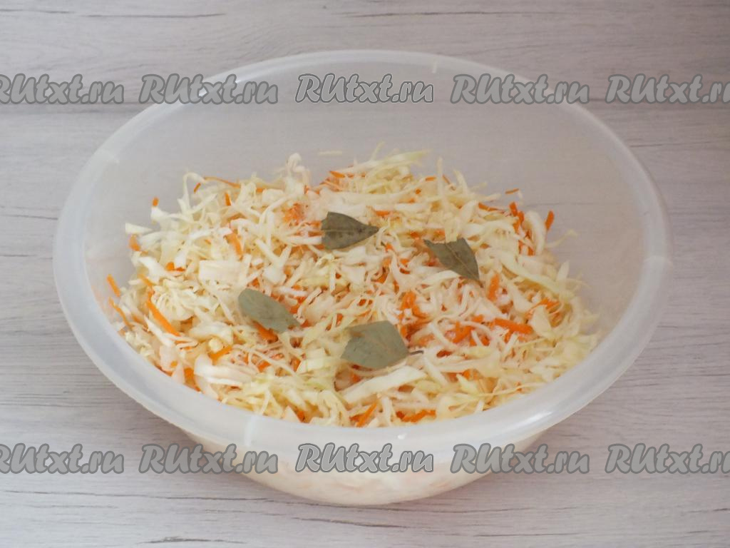 Морковь добавьте к капусте, перемешайте. Перетирать и жать овощи не нужно! Добавьте соль, разломанный на несколько кусочков лавровый лист, опять перемешайте.