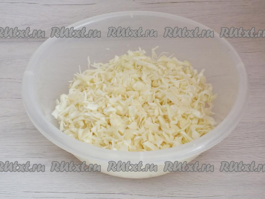 Подготовьте глубокую, широкую тару (это может быть пластиковая миска или тазик). Нашинкуйте тонко капусту и переложите в миску.
