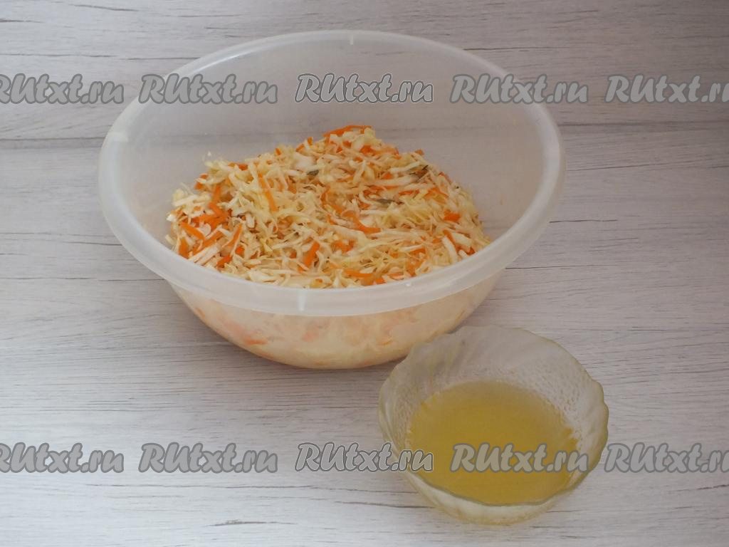 В миску с капустой и морковью добавьте смесь воды и мёда, перемешайте.